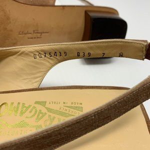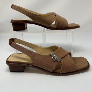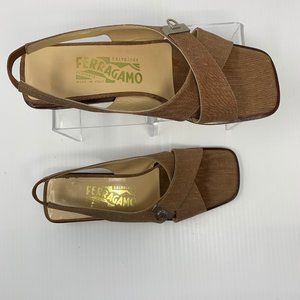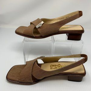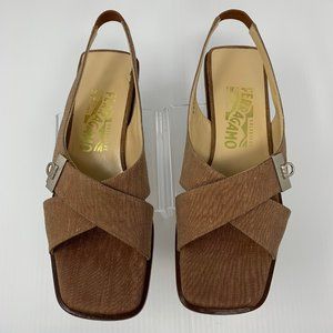 Salvatore Ferragamo Tiberia Brown Silk Square Toe Block Heel Slingback Sandals 7