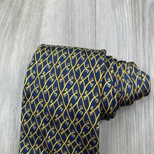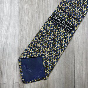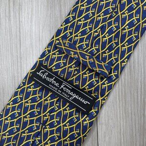 Salvatore Ferragamo Tie Mens Blue Gold Print Geometric Silk Luxury Necktie