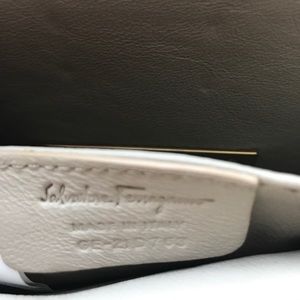 Leather lined interior features one slip pocket with a designer logo embossed gold plate