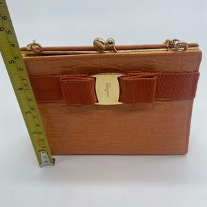 This bag has scuffs, scraps, scratches and marks from wear. See photos for best assessment of wear. Royal orange leather Vara Bow chain crossbody bag from Salvatore Ferragamo Vintage featuring an embossed crocodile effect, gold-tone hardware, an internal logo stamp, a bow on the front, a front logo plaque, a kiss lock closure and a chain shoulder strap that is long enough to wear as a crossbody.