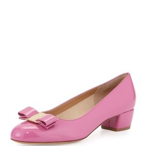 These classic Salvatore Ferragamo pumps are rendered in glossy patent leather and detailed with a bow and metal logo. A low heel adds gentle lift. Leather sole.