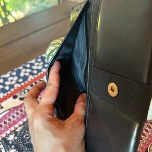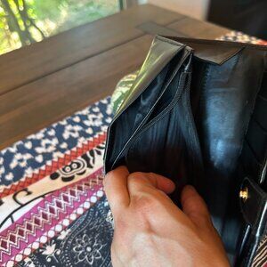 Has some light scratches with normal wear on leather and hardware as you can see in the photos. Beautiful interior with normal wear and no peeling or sticking. This long wallet is gorgeous. The edges are great and the corners have no wear or separation on corners.