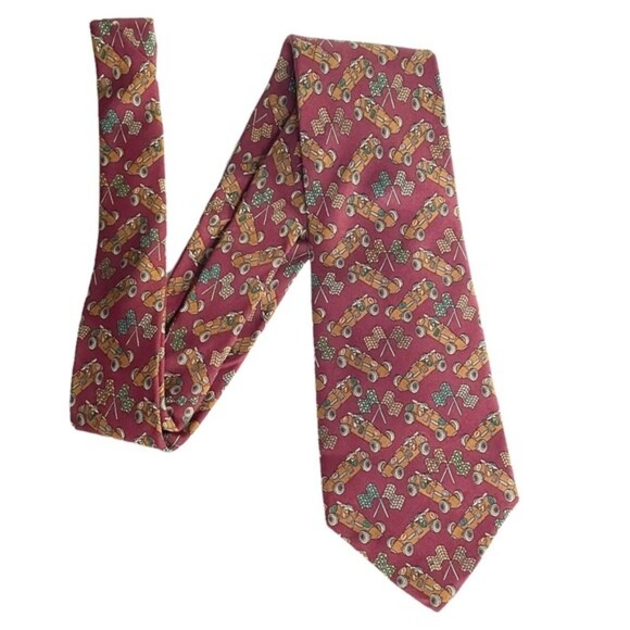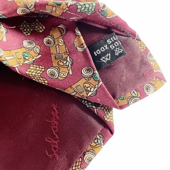 Designer silk tie with vintage open-wheel race car design by Ferragamo.