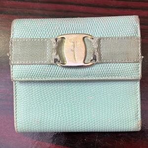 Vintage Salvatore Ferragamo blue lizard embossed leather wallet with gold tone vara motif. 8 card slots,