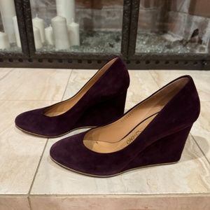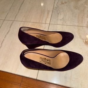 Salvatore Ferragamo Wedge Pumps 9B Plum Purple Suede Gold Chain