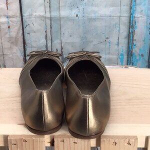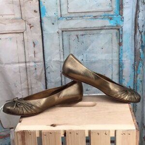 A chic pair of Salvatore Ferragamo Woman's 8.5 AA ballet flats. These have a metallic bronze gold tone and are made from genuine leather. Pleats and a bow add a touch of femininity.