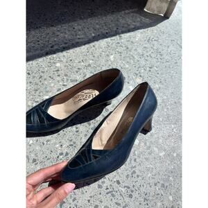 Salvatore Ferragamo Women’s 7.5 Heels Navy Leather Suede Kitten Heels Vintage