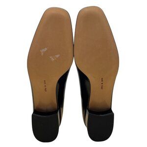 Elegant patent leather loafers with a low block heel and metallic buckle detail. Comfortable fit and classic design for versatile styling.