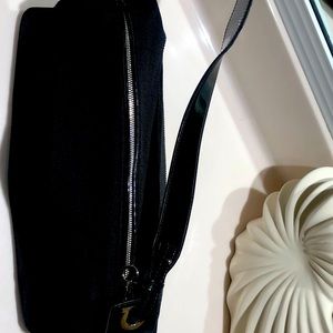EUC Salvatore Ferragamo black nylon/patent leather, layered ribbed, zippered shoulder bag.