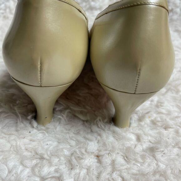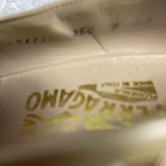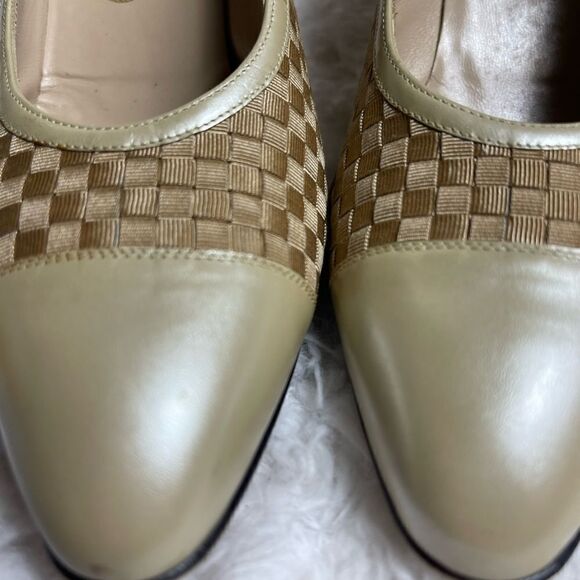 Salvatore Ferragamo light gold Leather & Brown Woven Ribbon slip on heels size 9 AA ,2.5” heels.pre owned in good used signs of wear on the outer soles run small see measurements pictures for size accuracy