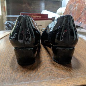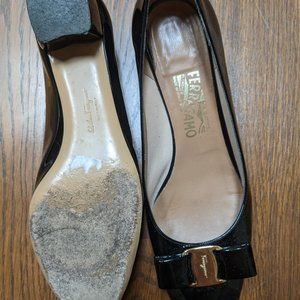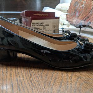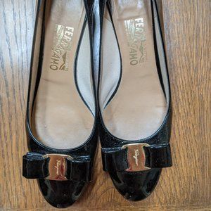 The Classic Vara Pump in beautiful black patent calfskin leather Gross-grain bows with gold-tone logo plate. Very good used condition. Minimal marks on shoe and gentle wear on soles. Size 9.5 B 1.25 inch heel Made in Italy