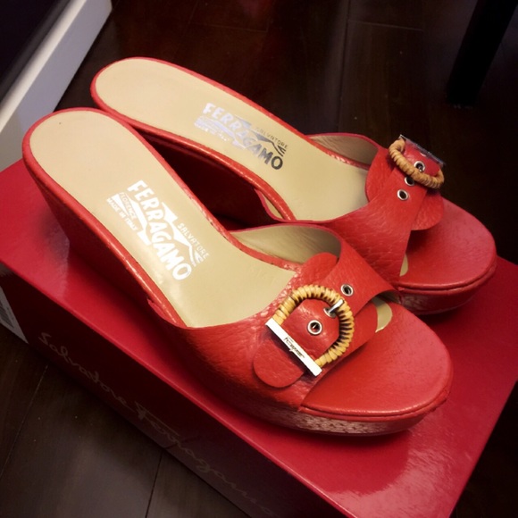 ✨Trendy✨Paprika-red platform wedged heel leather sandals, size 6.5B, 2.5" high, adjustable buckle, vintage style, very soft leather, in excellent condition, guaranteed authentic, kept in original box. No trades. Final price.