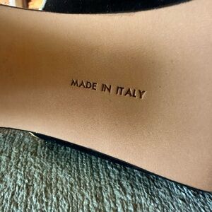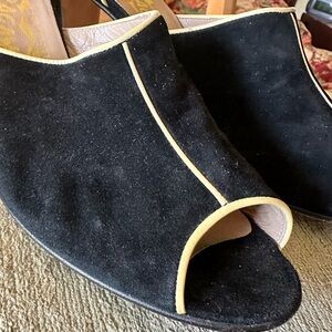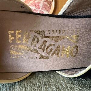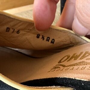 Designer brand Salvatore Ferragamo black suede leather pumps with pale yellow accents. Classic vintage heels marked size 8.5 AAA , but fit perfectly as a size 8 narrow. Made in Italy. Please see all pics for condition.