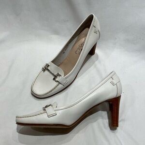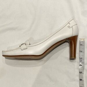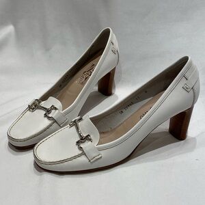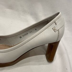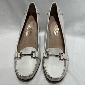 New without box leather heels from Salvatore Ferragamo. These are white, not off white, with silver horsebit buckle trim. Beautiful but I still haven’t worn them so hoping someone else will! Size 11B, 3” heel.