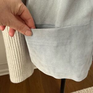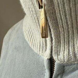 Women’s Salvatore Ferragamo luxury brand mixed material full zip sweater vest. Gold tone logo stamped zipper pull. The collar, back and arms are ripped light blue, and the ivory wool and cashmere blend yarn. Very soft. The front is buttery soft swayed light blue leather. The lining is embossed with the logo throughout and is 100% Rayon. Made in Italy. Laying flat measures 25 inches shoulder to hem and 20 inches armpit to armpit. I would recommend dry cleaning. There are two black spots near the side seam on the right hand side. One is about 6 inches down from the armpit and the other is right along the hem.