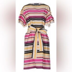 Vibrant and stylish, this striped dress features a playful mix of pink, yellow, and black. Perfect for any occasion, it offers a flattering fit with a matching belt to accentuate your waist. New, no tags