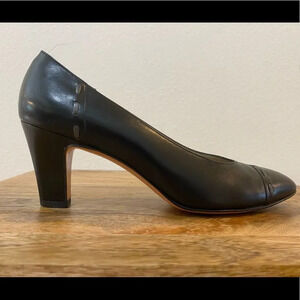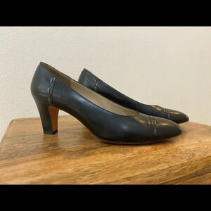 These Salvatore Ferragamo Black Leather Pumps are in good used condition. There is wear to the shoe’s interior and also the sole and top lifts. Some minimal rubbing. Supple Italian leather. Whip stitch detail at heal and vamp. Size 7B