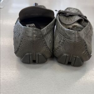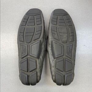 Elegant dark gray loafers with unique texture. Features signature buckle detail. Ideal for sophisticated style.