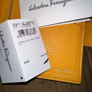 Vibrant sun yellow leather piece by Salvatore Ferragamo. Features a textured finish and elegant branding.