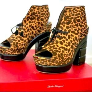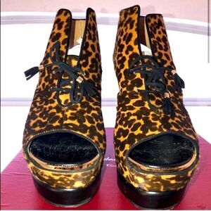 Beautiful pony hair leopard print chunky open toe heels. Lace up in the front. Worn once. EUC
