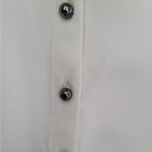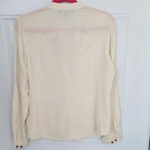 Off white, silk. two button cuff sleeves. The last two buttons towards the bottom are missing. May be worn tucked in for discretion or may remove one of the two at sleeves to use as replacement. Other than that Great preowned condition. Size 44/ Medium