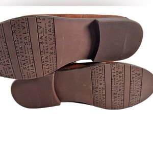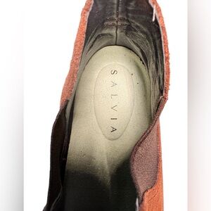 Waterproof cognac suede ankle boots by Salvia, designed with Hydra waterproof technology for all-weather wear. Chelsea silhouette features elastic side panels, low stacked heel, and pull tab for easy slip-on style. One rear pull tab detached (see photos) and light scuffing present, but overall structure and traction are excellent. Stylish, durable, and versatile—perfect for fall or winter wardrobes.