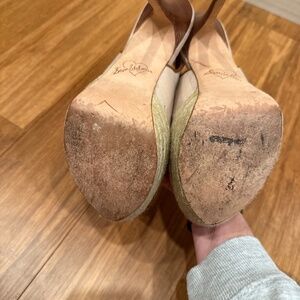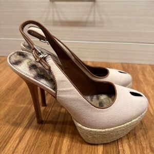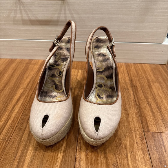 Sam Edelman Novato Platform Peep-Toe Stiletto Heels. Size 6.5 Canvas upper with brown leather trim. Tear-shaped peep toe cutout. Almond toe. Slingback heel strap with adjustable buckle. Espadrille woven platform in front. Stacked wooden skinny heel. Lightly cushioned leopard print insole with Sam Edelman signature script. Color: sand and brown. Tan, beige, nude. Approximate 5” heel and 1.5" platform, which is equivalent to a 3.5" heel height. Minor spots from light wear. Very good pre-owned condition. Size 6.5