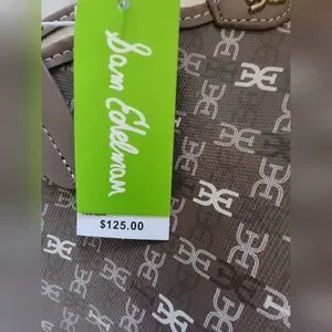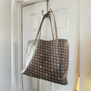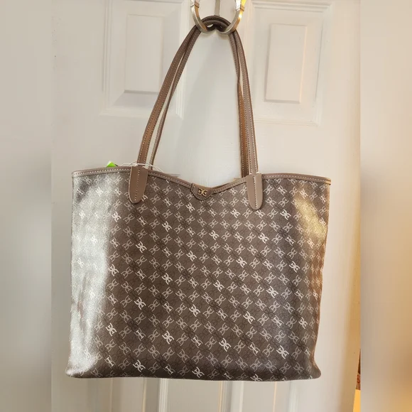 Sam Edelman Harper medium shopper tote bag in coated canvas with a monogram pattern.