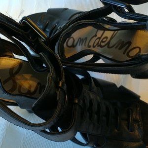Sam Edelman 6M black 4-1/2" heels. (EUR 36) Zipper on back and buckle on side. Leather uppers. Made in China. Condition: Signs of wear on bottoms, but otherwise look new. Note: will be shipped in a Basics shoe box.