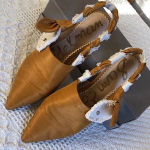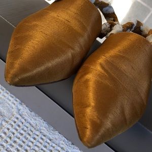 Sam Edelman ‘river’ 7.5 Golden Thai silk like fabric, dressy and fun. GUC see photos for details!