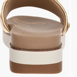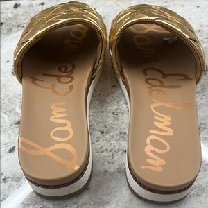 Slip on this easy-wear slide sandal constructed with a woven leather strap and comfortably contoured footbed.