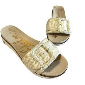 Sam Edelman Ariane Pearl Studded Beaded Buckle Woven Raffia Slide Beige Platform Boho Chic Sandals