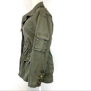 Sam Edelman Army Green Military Jacket . Size XS. Seven buttons down front. Two square hand pockets near waist w/ flaps. Cargo pocket w/ flap on chest & two zipper chest pockets. One cargo pocket w/ flap on sleeve. Sleeves have cute buttons at cuff (yellow, red, and different style buttons). Shoulder tabs for detail. Drawstrings at waist are located inside jacket. Made of 97% cotton and 3% spandex. Measures about 27” long from shoulder to bottom hem, about 20” across chest laying flat.