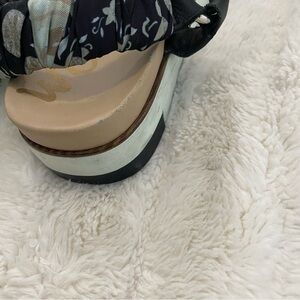 Stylish floral printed scarf sandals with black straps. Comfortable and trendy.