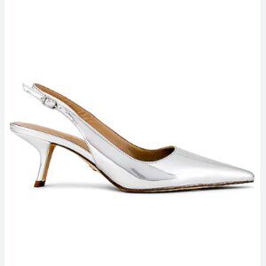Features: metallic patent synthetic upper, adjustable slingback strap closure, pointed toe, synthetic lining, lightly padded footbed, 2.5" slanted heel, sleek metallic sheen, artsy slanted heel