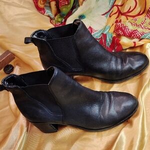 These Sam Edelman ankle boots are crafted in sleek black leather, featuring a medium stacked heel and a distinctive V-shaped opening for easy slip-on wear. The slightly rounded toe offers a comfortable fit, making them a stylish and versatile addition to any wardrobe. one rubber price on heel missing.