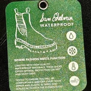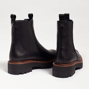 These sleek black Chelsea boots by Sam Edelman feature a modern chunky design with a robust platform sole for excellent traction. Crafted for winter and rain, they offer easy slip-on wear with elastic side panels and a minimalist aesthetic.