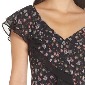 New With Tags (NWT) Sam Edelman Black Floral V-Neck Ruffled Dress, Size 4. Very chic & feminine dress featuring a cute floral print, adjustable flutter sleeves to wear on shoulder or cold shoulder, pretty chiffon overlay w/ ruffle trim, adjustable spaghetti straps, flattering v-neckline, polyester lining. Concealed zip in back w/ hook & eye closure at top.