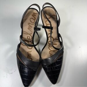 These are Sam Edelman women's heels in size 7 M. The slingback style features a pointed stiletto heel in black leather with buckle closure. Ideal for various occasions, the shoes have adjustable straps for comfort and breathability. The design includes straps and the Sam Edelman logo, suitable for summer, fall, and spring wear. Made of faux leather lining and leather upper.