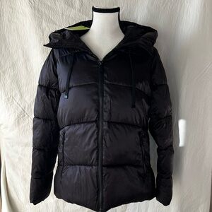 Stay cozy and chic with the Sam Edelman Black Puffer Coat, featuring a sleek quilted design and a practical hood. This hip-length coat offers excellent warmth and a smooth, water-resistant finish, making it ideal for cold weather.