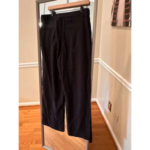These pants are made of a soft, smooth fabric and have a relaxed fit. They feature a high waist, wide legs, a zipper fly and button closure, two front pockets, and two back pockets. The pants are in excellent condition and show no signs of wear or damage.
