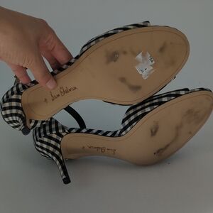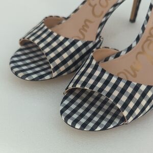Elevate your style with these Sam Edelman heels, featuring a striking black and white design. The classic gingham pattern adds a touch of vintage charm, while the sleek heel silhouette ensures a sophisticated look. Perfect for making a statement at any event.