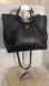 Black pebble leather with hoop handles that are partly covered with a refined leather with cross cross design. Interior has 3 main compartments middle has zipper closure. 1 side zipper and 2 slip pockets. Gold hardware and adjustable crossbody or shoulder strap. Minimal scuffs, corners have light wear.