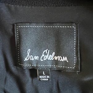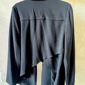 Long in front, cropped in back with flowy cross-back detail. Structured shoulders and clean tailoring.
