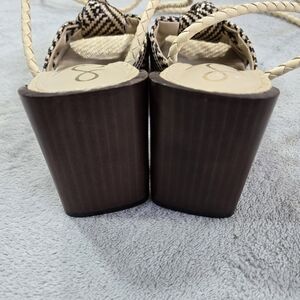 Worn once. Tan, brown and black sandals, with a wooden block heel. The wraparound straps add interest. Has minor wear at the inner left heel (last photo).