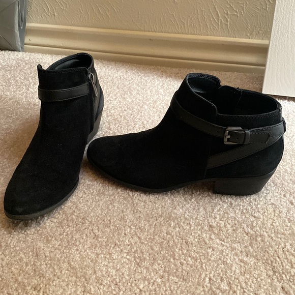 These black Sam Edelman booties are in great condition. They are suede and leather with a zipper and buckle detail. About a 1” heel lift.