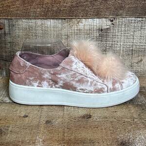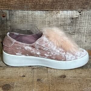 Sam Edelman Breeze Blush Velvet Slip On Shoes. Size 8.5. Color ~ Light pink. Velvet with 2 fluffy fur balls on the tongue. Excellent condition, does have some peeling on the inside heels. See pics.