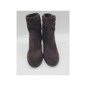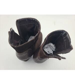 Sam Edelman Women's Size 7.5 Brown Suede & Leather Ankle Boot Booties. Features: Brown Suede & Leather 4" Chunky Stacked Heel Hidden side zipper closure Round toe Lug sole SE embossed on side of heels Great vintage condition. Very minor wear on toes and light peeling of soft inner leather interior lining. The peeling could be brushed off and never seen. It looks like one heel panel has a snake skin leather pattern. Still looks good. Weight 2 lb. 3 oz. (bx10x10x7)