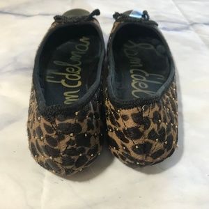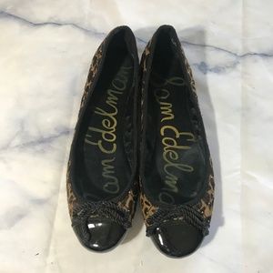 Cute and fun Sam Edelman ballet flats! Lovely calf hair quilted leopard print design with a black toe and bow accent. Quilting has little gold studs accenting throughout. In very good condition!