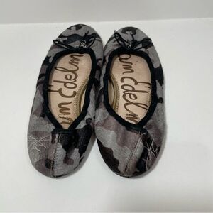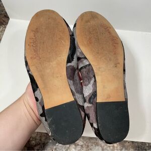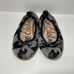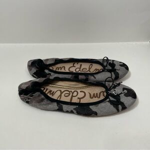 Gently worn women’s size 6 Sam Edelman, calf hair, leather round toe flats. Black and gray Camouflage and Print, bow detail on the toe. Please review all photos for any signs of wear-pictured as is. Disclaimer: Any items with any wear/staining has not been treated, and unsure of ability to remove/treat condition. Comes from a smoke free home, bundle with other items to save & minimize shipping cost.